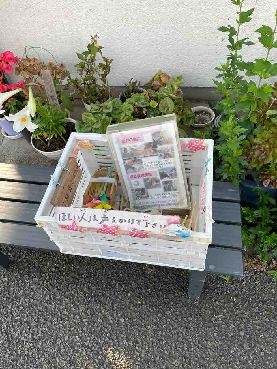 ほしい人は声をかけて下さいと書いてある箱が置いてある