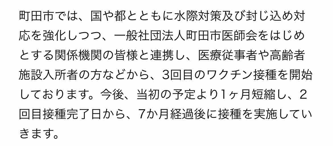 町田市も3回目の接種を1ヶ月短縮し早めにワクチンを接種してもらおうと動いています。
