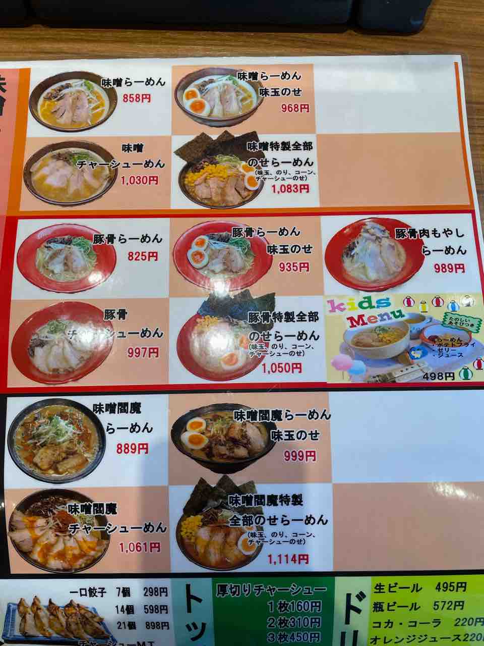 味噌ラーメンかとんこつラーメンがメインなんですね、キッズメニューもあるんだ。